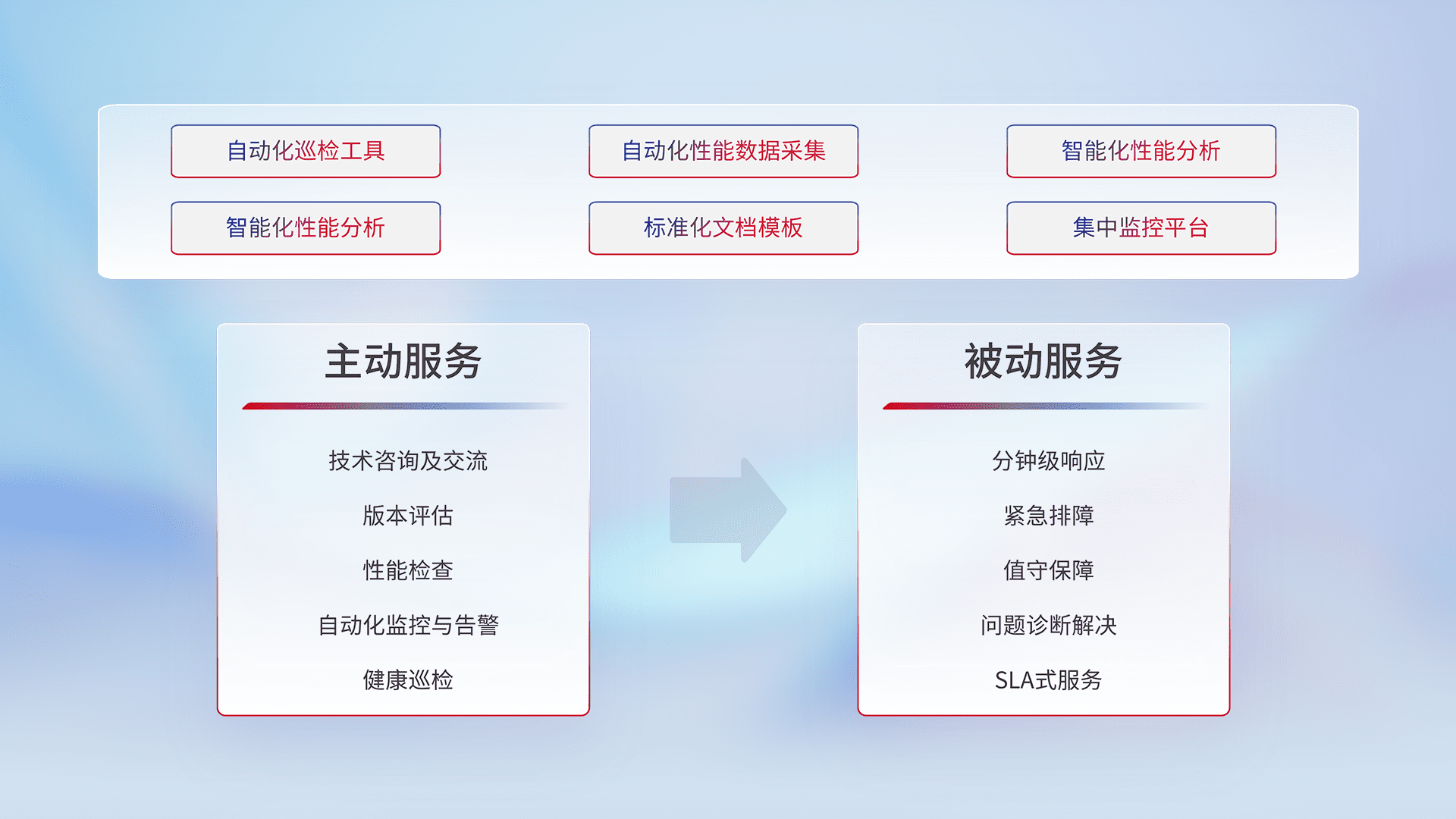 智能化工具和标准化文档,,,,保障服务质量,,,提供主动服务(包含技术咨询、、版本评估、、、、性能检查、、、自动化监控与告警、、健康巡检)和被动服务包含(分钟级响应、、、、紧急排障、、、值守保障、、、、问题诊断解决、、、SLA服务)。。。。